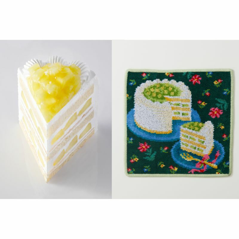 大人気の「スーパーメロンショートケーキ」をホールサイズであしらいました。 テーブルクロスは、フェイラーの人気デザイン『ハイジフラワー』をホテルニューオータニオリジナルのロイヤルグリーンで表現し、ハンカチの縁どりカラーは「ペールグリーン」「ペールピンク」「ターコイズブルー」の3色をご用意いたしました。 1ピースに付きマスクメロン3分の1個分を使用した、生地・クリーム・フルーツが三位一体となった最上級のショートケーキ。 絵柄にも入った、スーパーメロンショートケーキ柄のハンカチをセットでお愉しみください。