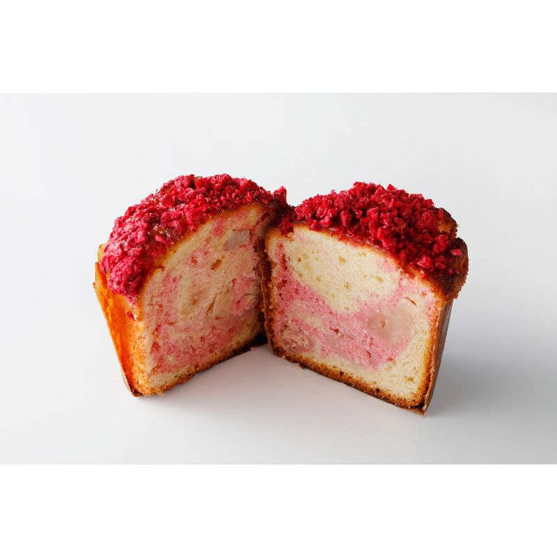 特製マフィン生地とバラの生地をマーブル状にし、ライチのジュレを加え、ドライフランボワーズで仕上げました。ドライフランボワーズを乗せたフローラルの香りが口に広がるマフィン。