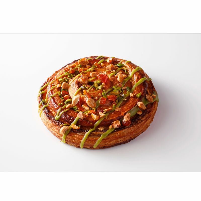 サクッとしたクロワッサン生地にたっぷりのピスタチオフィリングを巻き、プラリネアーモンドとピスタチオフォンダンを乗せて仕上げました。