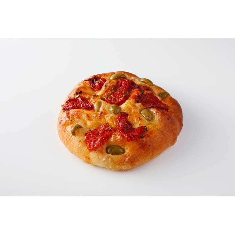 もちもちとした食感が特徴のフォカッチャに凝縮した甘みと酸味が魅力のセミドライトマト、オリーブをトッピングし、仕上げにバジルソースをのせた総菜パンです。