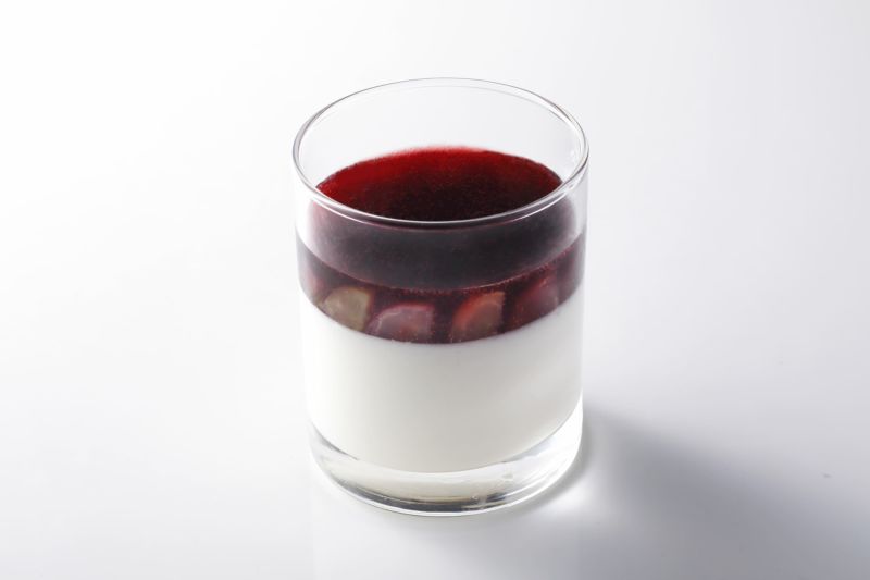 岩手県産の岩泉(いわいずみ)ヨーグルトを使用したゼリーに、シャインマスカット・ピオーネの果肉とグレープゼリーをトッピングした、ぶどうの濃厚な甘さ引き立つ秋限定のグラススイーツ。