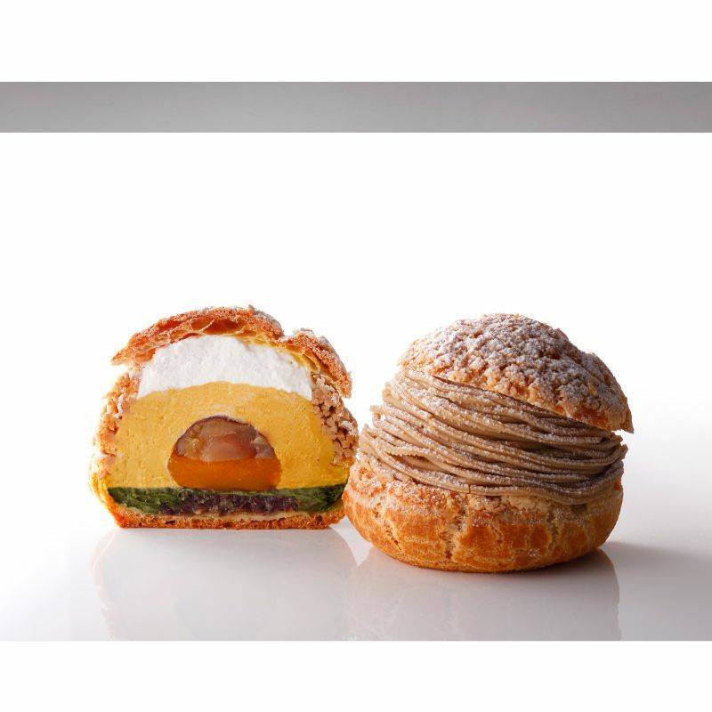 外はサクッと中はしっとりしたクッキーシュー生地に黒蜜あんこ、抹茶カスタードクリーム、パッションフルーツジュレ、渋皮栗に濃厚なマロンカスタードクリームをのせ、仕上げにモンブランクリームを絞った秋限定のシュークリームです。